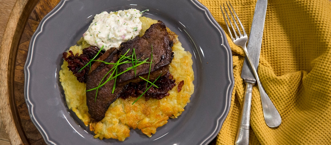 Tisztítsuk meg a májat, és hagyjuk szobahőmérsékleten pihenni. Keverjük össze a lereszelt nyers és a megtört főttburgonyát, ízesítsük, majd serpenyőben süssünk hashbrownt belőle. A hagymát félfőre vágjuk, és aranybarnára dinszteljük. Kevés cukorral karamellizáljuk, balzsamecettel ízesítve hagymalekvárt főzünk. A májat sózzuk és borsozzuk, hirtelen mepirítjuk, worchester-szósszal locsoljuk meg. Finomra vágjuk a salottát és az uborkát, összekeverjük majonézzel és egy kis Worchesterrel, sózzuk, borsozzuk, snidlinget vágunk bele.