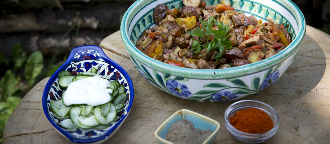 A vékony csíkokra vágott, zsírjára pirított szalonnákon hirtelen megsütjük a szintén csíkozott szűzet. Hozzáadjuk a zúzott fokhagymát, sózzuk, borsozzuk. Néhány perc pirítás után félrehúzzuk és hozzáforgatjuk a kockázott paprikát, paradicsomot, finomra vágott friss petrezselymet, majd az egészet összekeverjük a sós vízben előfőzött, leszűrt és kevés zsírban ropogósra sütött, kockázott burgonyát. A vékony karikára vágott uborkát lesózzuk, állni hagyjuk. Sóval, cukorral, ecettel, vízzel, kevés reszelt fokhagymával hagyományos saláta ecetet készítünk. Ebbe tesszük a kinyomkodott uborkát és ízlés szerint tejföllel kínáljuk.