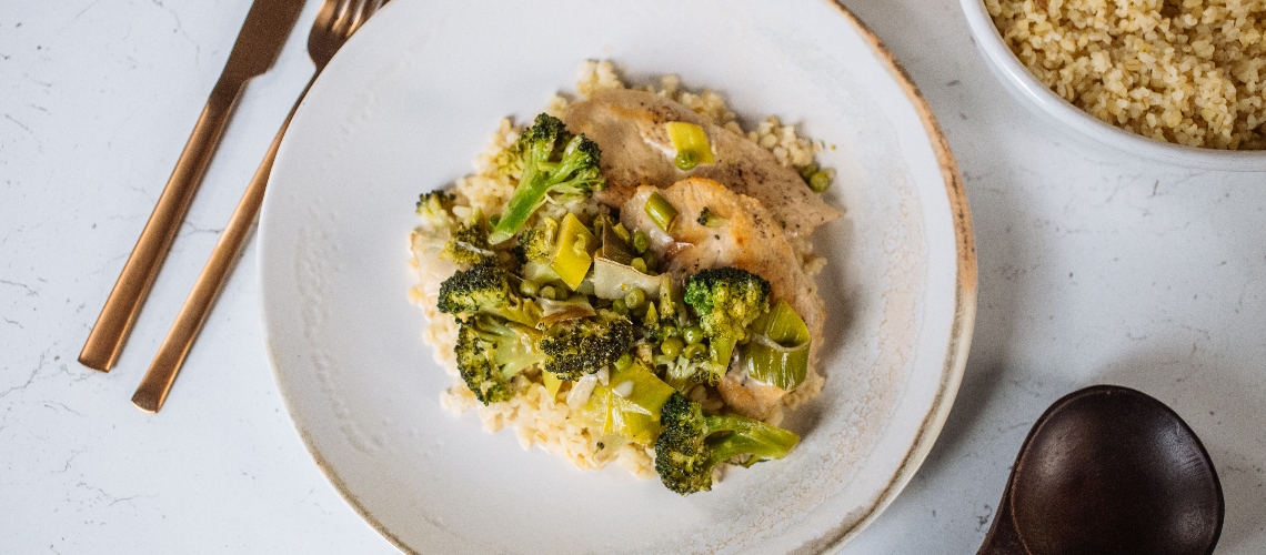 A póréhagymát felkarikázzuk és a serpenyőbe tesszük, lepirítjuk és hozzáadjuk a rózsáira szedett és kisebb darabokra vágott brokkolit és a zöldborsót. Ezeket is körbe pirítjuk, majd felöntjük a borral majd, ha elpárolgott az alkoholtartalma, a zöldség alaplével is. Puhára főzzük a húst, és közben ha kell, sózzuk, borsozzuk az ételt. A végén a tejszínnel gazdagítjuk és további 2 percig rotyogtatjuk, hogy besűrűsödjön.