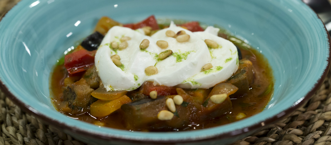 A padlizsánt felkockázzuk, olajjal összekeverjük és 200 fokon megszárítjuk, a paprikákat, cukkinit, és a hagymát egyforma darabra vágjuk és olíván elkezdjük pirítani lassan. Felöntjük a paradicsom lével, hozzáadjuk a padlizsánt és az olajbogyót, sózzuk majd 10-15 percig főzzük.