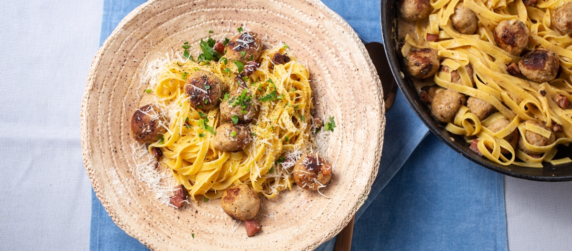 A serpenyőt ismét felhevítjük, majd elzárjuk alatta a lángot és a kifőtt tésztát beleforgatjuk a serpenyőben maradt zsidékba. Összerázzuk, majd ráöntjük a tojásos keveréket, a tészta főzővizét, és ha kicsit kihűlt a serpenyő, picit visszarakjuk a tűzre. Folyamatosan rázogatjuk addig, amíg az egész krémes nem lesz. Azonnal tálaljuk a húsgolyókkal és frissen reszelt parmezánnal.