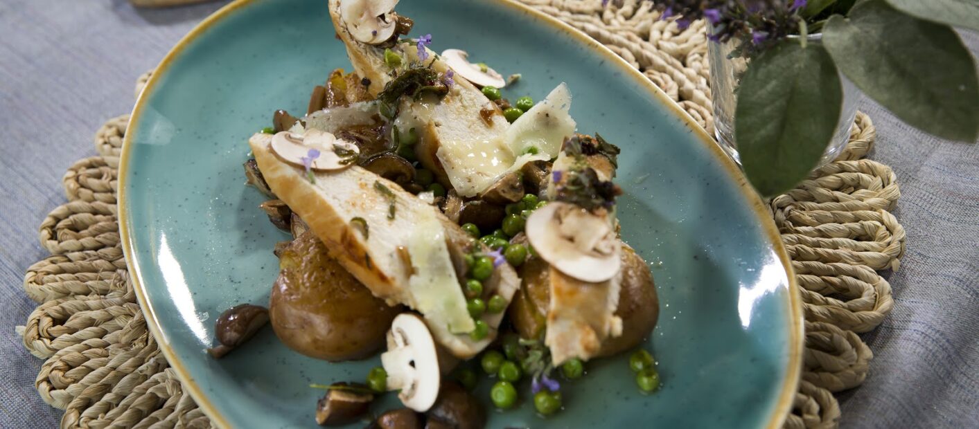 Egy másik serpenyőben vajban és olívaolajon kisütjük az újburgonyát. Hozzáadjuk az apróra vágott salottahagymát, fokhagymát és a gombát. Fűszerezzük, rakjunk hozzá egy kis kakukkfüvet és pirítsuk meg. Végül rászórjuk a borsót, felöntjük a borral és jól összekeverjük.