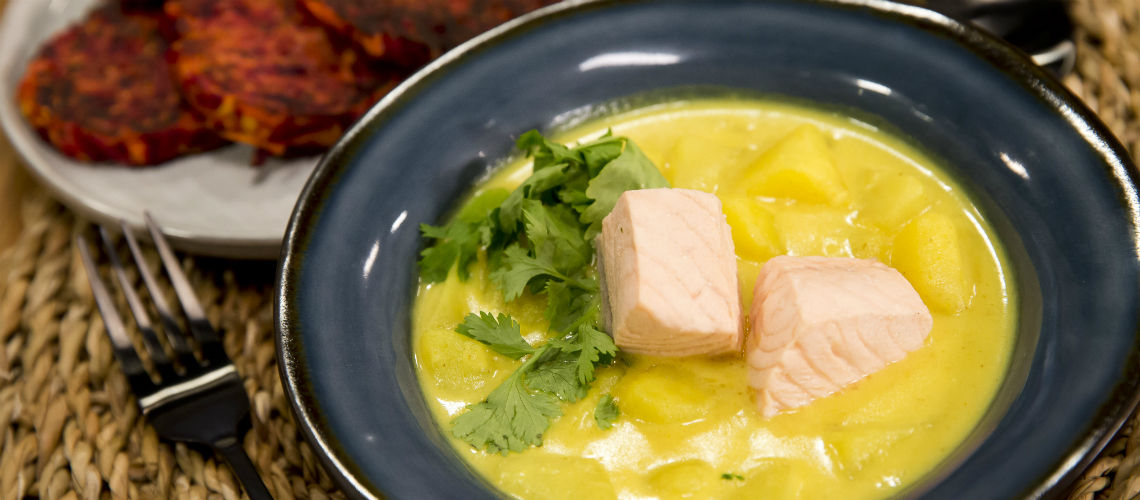 A főzelékhez a vajat olvasszuk össze 1 ek olajjal. Borítsuk rá a hagymát, finoman sózzuk majd pároljuk 4-5 percig. Reszeljük rá a fokhagymát, szórjuk meg a curryvel majd forgassuk bele a krumplit. Öntsük fel annyi vízzel, amennyi éppen csak ellepi ( a krumplszemek lógjanak ki a vízből), dobjuk bele a babérlevelet, sózzuk negyed teáskanál sóval, majd lefedve, közepes lángon a forrástól számítva tíz-tizenkét perc alatt főzzük puhára. Ne főzzük teljesen szét, picit maradjon harapható. A megfőtt alap harmadát szedjük ki, pürésítsük, majd keverjük vissza az alaphoz. Öntsük hozzá a kókuszkrémet, lime levével, sóval ízesítsük.