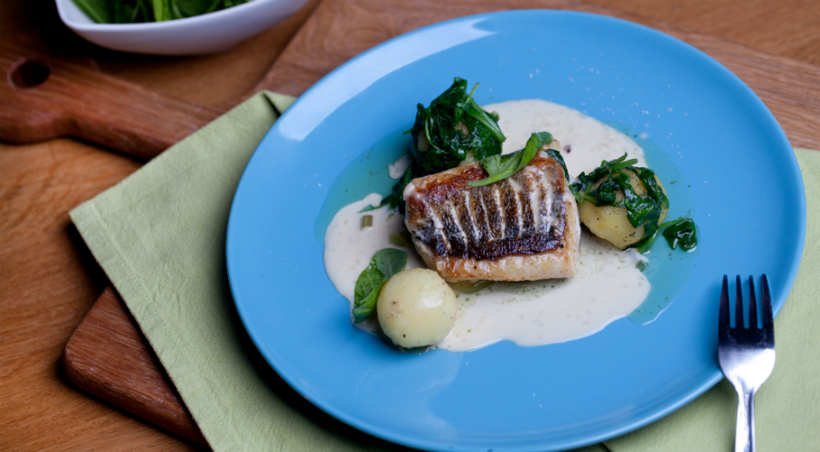 Egy edénybe olajat öntönk és megpirítjuk rajta a salotta hagymát, zellert, kaukkfüvet és borókabogyót. Felöntjük borral és kicsit összeforraljuk. Hozzáadjuk a tejszínt, elkeverjük, és a mártást hagyjuk besűrűsödni. Közvetlenül tálalás előtt elkeverjük vajkockákkal. A fogast két nagyobb darabra vágjuk, a bőrét beirdaljuk. A húsos felét megszórjuk sóval és borssal. Egy serpenyőben olívaolajat hevítünk majd a halat először bőrös, majd másik felével, oldalalnként 3-4 perc alatt megsütjük. Ezután a halat kivesszük a serpneyőből és 2 percig pihentetjük. Főtt, vagy sült burgonyával tálaljuk a mártással leöntve. Petrezselyemmel feldíszítjük. Legjobb köret hozzá a spenót.