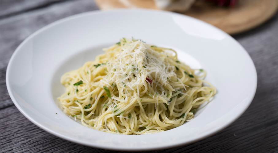 A szeletelt chili paprikát és fokhagymát kevés olívaolajban megpirítjuk, majd rátesszük az al dentére főzött spagettit és a vágott petrezselyemmel együtt összeforgatjuk. Sózzuk, borsozzuk. Reszelt parmezánnal tálaljuk.