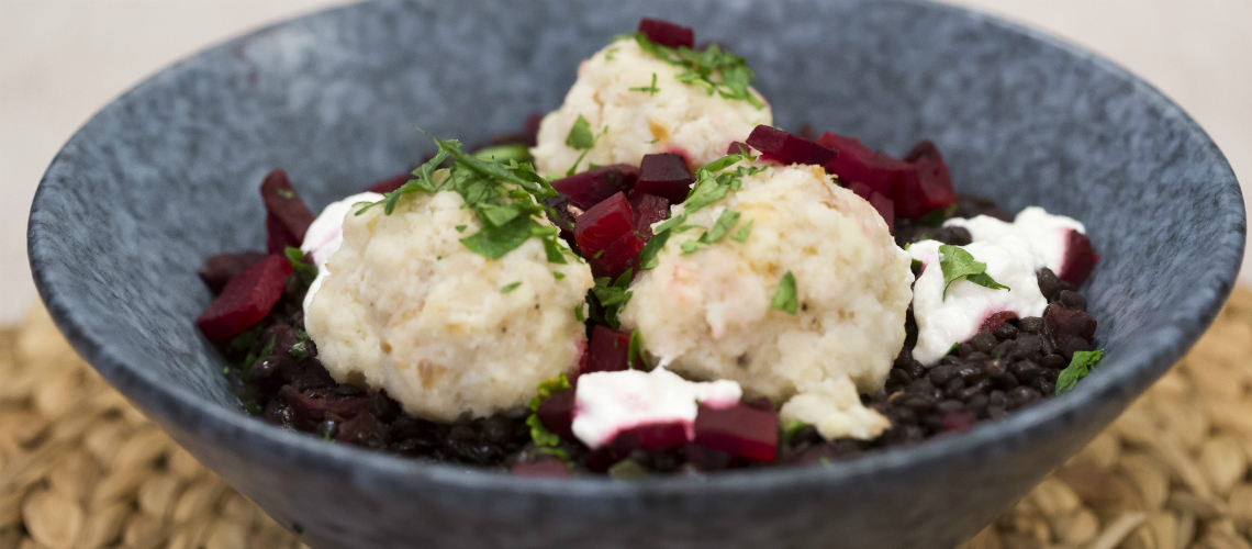 Tálalásnál a lencsére sűrű joghurtot kanalazunk, erre szórjuk a maradék céklát, majd ráhalmozzuk a gefilte fish-t, végül az egészet meghintjük sok friss petrezselyemmel.