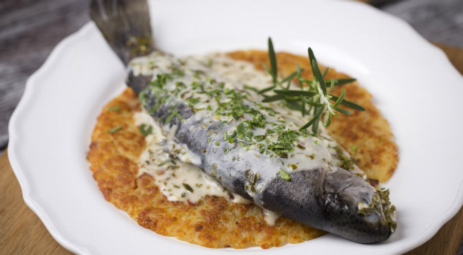 A halat kivesszük a léből. Egy lábasban a maradék vajon kevés lisztet pirítunk és felöntjük a hal főzőlevével. Tejszínnel beforraljuk és ezt a mártást kínáljuk a pisztránghoz, röstivel tálaljuk.