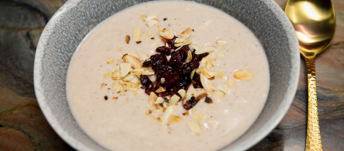 Tálalás: a tányérban lehűtött levesre szórjuk az áfonyát és a mandulát.