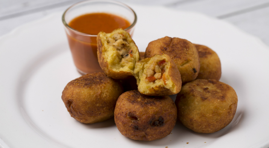 A kihűlt, főtt, pucolt burgonyát lereszeljük, összedolgozzuk a liszttel, a zsírral, 2 db tojássárgájával, csipet sóval. Fél fej finomra vágott vöröshagymát kevés olajban megpirítunk, majd rátesszük a darabolt tőkehalat. Sózzuk, borsozzuk. Hozzáadjuk az apróra vágott, marinált paprikát és lehűtjük. A burgonyás tésztát kinyújtjuk, négyzetekre vágjuk, kevés halas tölteléket halmozunk a közepükbe. A négyzetek négy szélét behajtva gombócokat formázunk. A gombócokat zsemlemorzsában megforgatjuk és közepesen forró olajban néhány perc alatt ropogósra sütjük. Közben a maradék vöröshagymán megpirítjuk a darabolt chili paprikát és a fokhagymát. Rátesszük a paradicsomkonzervet, kevés vízzel felöntjük. Sózzuk, fűszerezzük borssal, fahéjjal, oregánóval, majd belecsavarjuk egy narancs levét és kevés cukrot adunk hozzá. Alaposan beforraljuk, majd pürésítjük. Tálaláskor a sült gombócokat ezzel a mártással kínáljuk.
