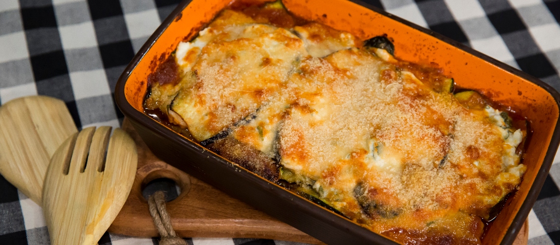 A marhahúst apróra daráljuk. A hagymát megpirítjuk, kevés cukorral karamellizáljuk. Hozzáadjuk a darált marhahúst, kakukkfüvet és felöntjük vörösborral. A paradicsommal kb. 10 percig pároljuk. Vágjuk a cukkinit és a padlizsánt vékony, hosszú csíkokra, és óvatosan pirítsuk meg olívaolajon. Keverjük össze a ricottát bazsalikommal, sóval és borssal. Rétegezzük a húst, a zöldséget, a ricottát a tepsibe, szórjuk meg sajttal, majd süssük 20 percig 190 fokon.