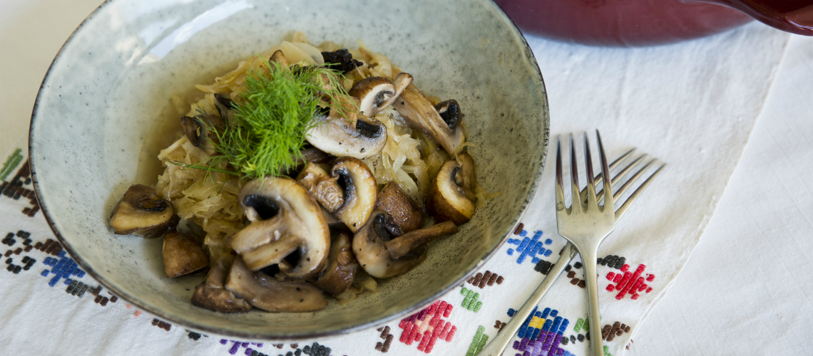 A szárított gombát kb. egy liter forró vízbe áztatjuk, min.1 órára. Utána kinyomkodjuk, és felszeleteljük. Az áztatóvizet főzőfolyadéknak használjuk majd. Nagy lábasban felhevítjük az olajat, hozzáadjuk a felszeletelt hagymát. A hagymát, valamint a vékonyra szeletelt fokhagymát alacsony hőfokon aranyszínűre karamellizáljuk. Kivesszük, félretesszük. Hozzáadjuk az édeskáposztát, és addig főzzük, amíg kissé összeesik. majd hozzáadjuk a savanyúkáposztát. Fűszerezzük sóval, borssal, fűszerköménnyel, babérlevéllel. Néhány percig főzzük, majd felöntjük 1 liter gombalével (amiben ázott a gomba) + annyi zöldségalaplével (vagy vízzel), hogy kb. a káposzta feléig felérjen (de viszonylag száraz egytálételt szeretnénk majd). Beletesszük az apróra vágott aszalt szilvát, és kevés nádcukorral ízesítjük. 140C fokos sütőben, lefedve, kb. 1,5 órái sütjük (de betehetjük 100C fokos sütőbe egész éjszakára). A friss csiperkét forró serpenyőben megpirítjuk, ezt frissen, tálalás előtt adjuk a bigoshoz.