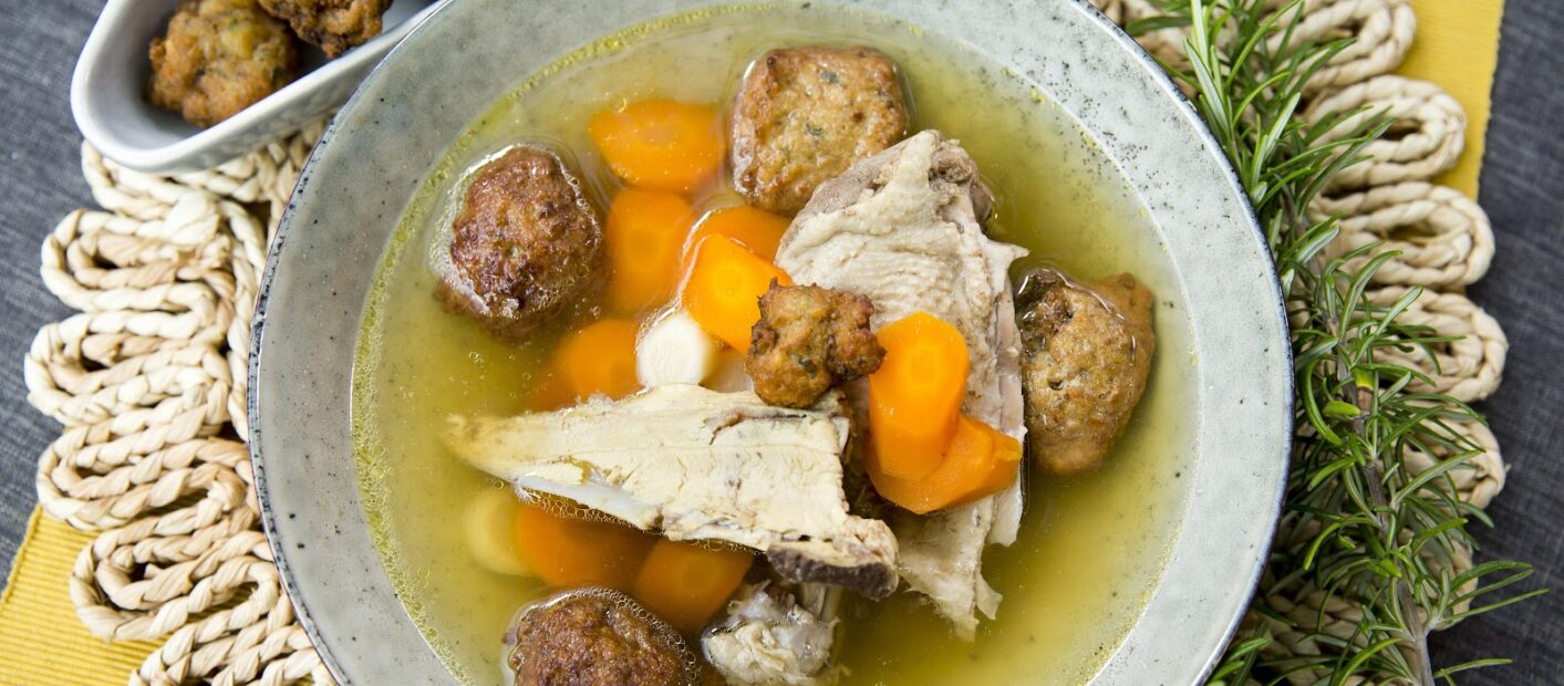 Tálaláskor a húsdarabokkal, zöldséggel, májgombóccal megrakott tányérokba merjük a levest.