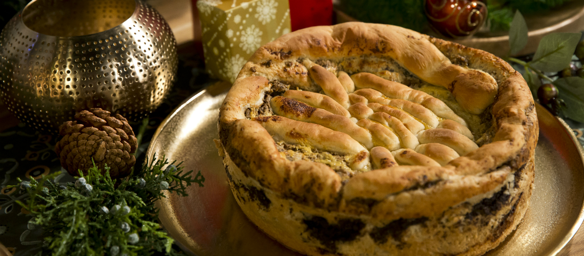 Az alaptésztához a meleg tejbe beleszórunk egy evőkanál cukrot, és belemorzsoljuk az élesztőt. Felfuttatjuk. Egy tálban összekeverjük a tönkölylisztet a nádcukorral, hozzáöntjük az olvasztott vajat. Kézzel gyúrjuk a tésztát, és kidolgozuk úgy, hogy ne tapadjon. Letakarjuk folpackkal és konyharuhával és hagyjuk megkelni. Közben elkészítjük a diós és a mákos töltelékeket: az összetevőket a tejen kívül alaposan összekeverjük egy tálban, majd leöntjük forró tejjel, és összedolgozzuk. A túrós töltelék összetevőit egyszerűen összekeverjük egy edényben. Elosztjuk a kikelt tésztát négy részre. Az első adagot kinyújtjuk és tepsire tesszük, mákos töltelékkel kenjük meg, aztán jön rá a következő réteg tészta, erre kerül a diós töltelék, megint egy réteg tészta és a végül erre jön a túrós töltelék. A maradék tésztából csíkokat vágunk és a süti tetejére rakjuk. Végül a süti tetejét megkenjük az olvasztott vaj és tojássárgája keverékével. 170 fokon kb. 40 percig sütjük.