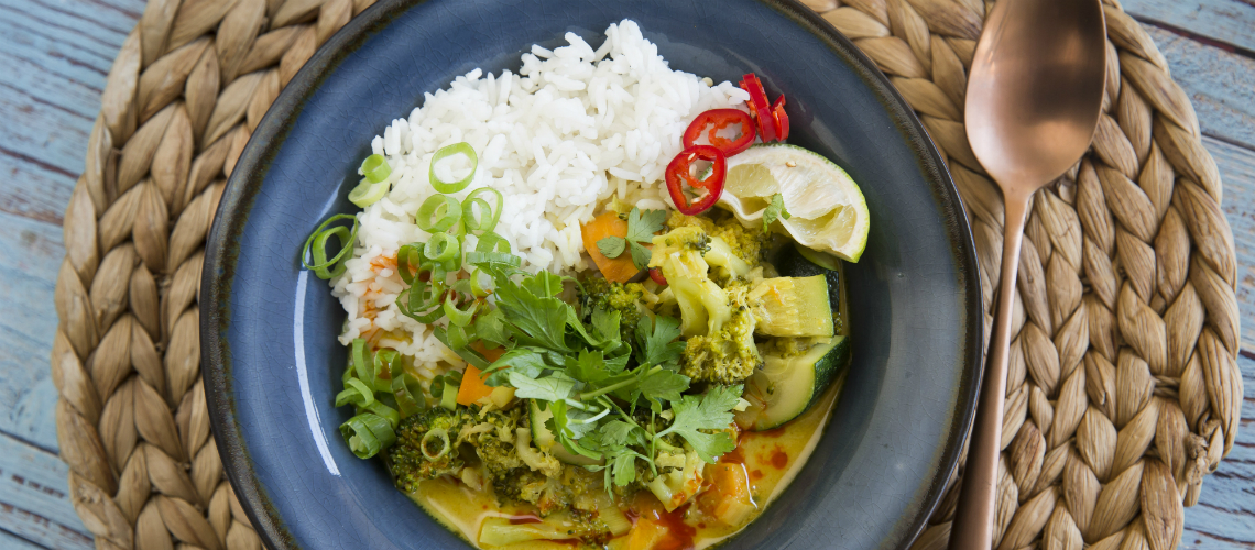 Kókusztejes, gyömbéres zöldségcurry jázminrizzsel