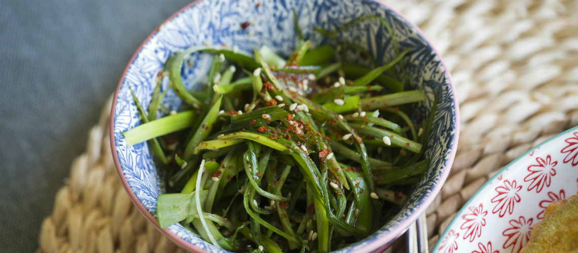 Az újhagymaszár salátához a hagyma zöldjét kb 10 cm-es darabokra, majd azokat hosszában, vékony gyufaszálra vágjuk. Jeges vízbe áztatjuk tíz percre, így veszít az erejéből. Közben összekeverünk 2 evőkanál szójaszószt, 1 evőkanál (rizs)ecetet, 1 teáskanál mézet, 1 teáskanál szezámolajat, 1 teáskanál piritott szezámmagot és 1 kávéskanál (koreai) chilipelyhet. Összeforgatjuk a lecsepegtetett zölddel. Hűtőben 2-3 napig eláll, szuper sültekhez, kiváló wokos ételekhez, vagy éppen sima rizzsel, vagy rántottán is.