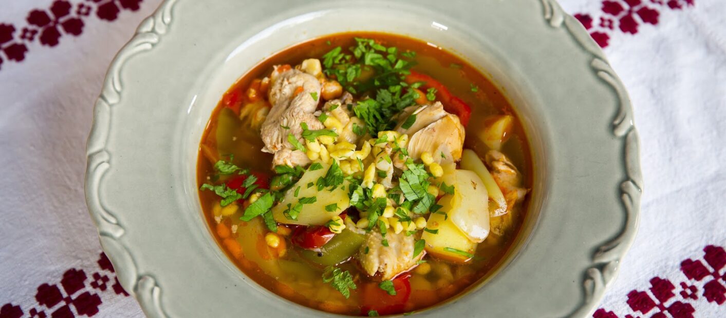 Amikor már majdnem elkészült, beledobjuk a felkockázott burgonyát és belefőzzük a házicsipetkét, majd beleszórjuk a maradék fűszerpaprikát.