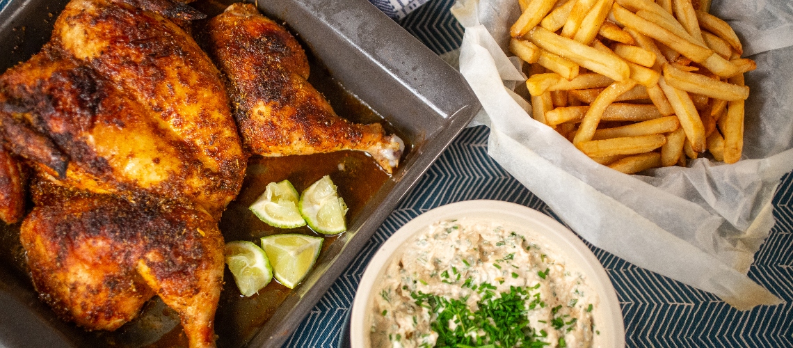 A sült csirkét a mártogatóssal és sült krumplival tálaljuk.