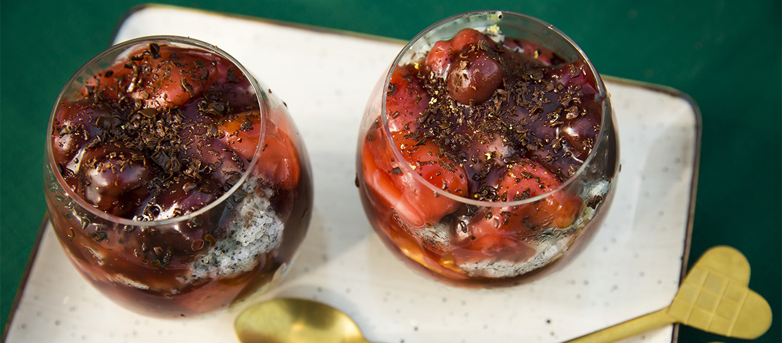 A gyümölcskocsonya: egy fazékban melegítsünk fel egy kevés meggybefőttet. Adjuk hozzá a felaprózott mirelit epret. Forraljuk fel a gyümölcsszószt. Keverjük el az étkezési keményítőt (vagy pudingport) kevés vízzel. Öntsük a hígított sűritőt a forrásban lévő gyümölcsökhöz, és forraljuk fel még egyszer, amíg besűrűsödik. Édesítsük cukorral. Vegyük le a tűzről, és tegyük félre hűlni. A gyümölcs megdermedve kocsonyás állagot vesz fel.