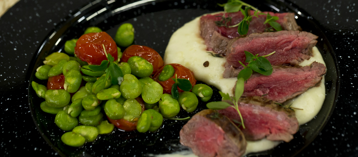 Meghámozzuk a burgonyát, kockára vágjuk, majd tejszín és víz keverékében megfőzzük. Ha elkészült, kakukkfűvel ízesítjük. A lóbabot blansírozzuk és lehűtjük. A koktélparadicsomokat félbevágjuk, sóval, barna cukorral, olajjal, oregánóval ízesítjük és 130 fokon sütőben megsütjük. A húst serpenyőben megpirítjuk, majd 210 fokon 5 perc alatt készre sütjük. A burgonyát habverővel pürésítjük. Tálaljuk a pürét, rá a hússzeleteket, mellé pedig a paradicsomos babot.