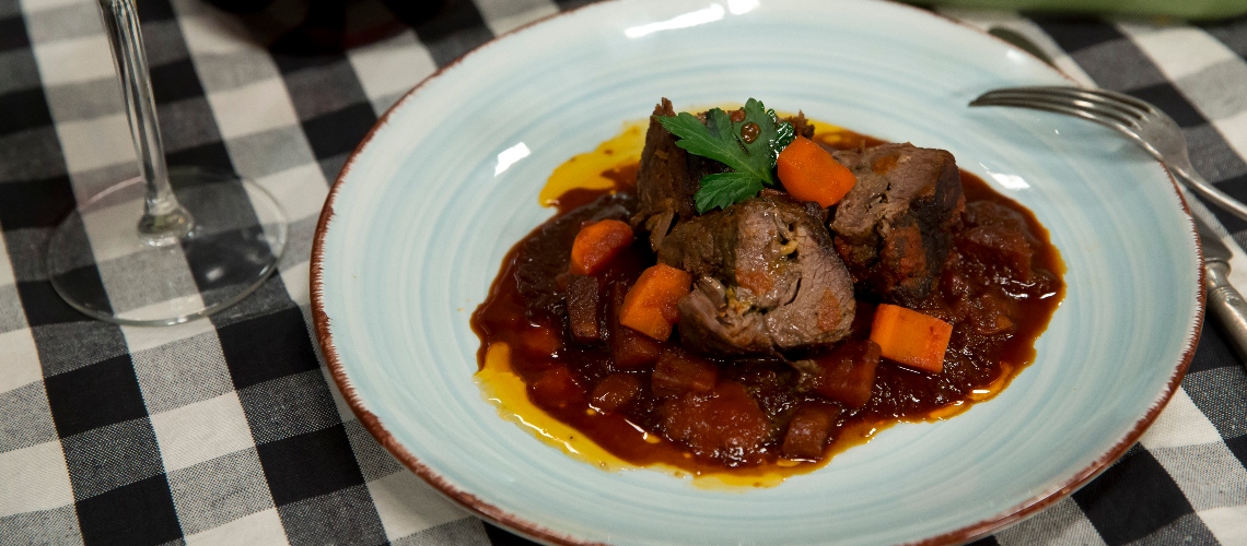 Késsel terítsük szét a marhahúst, fűszerezzük sóval, borssal és zöldfűszerekkel, majd tekerjük fel, kötözzük meg roládnak. Minden oldalról alaposan megkapatjuk, félretesszük. A kisült húslében megpirítjuk a zöldségeket, cukrot és paradicsompürét adunk hozzá. Visszatesszük a húst, majd felöntjük vörösborral. Keverjük hozzá apróra vágott paradicsomot, és pároljuk körülbelül 2 órán át.