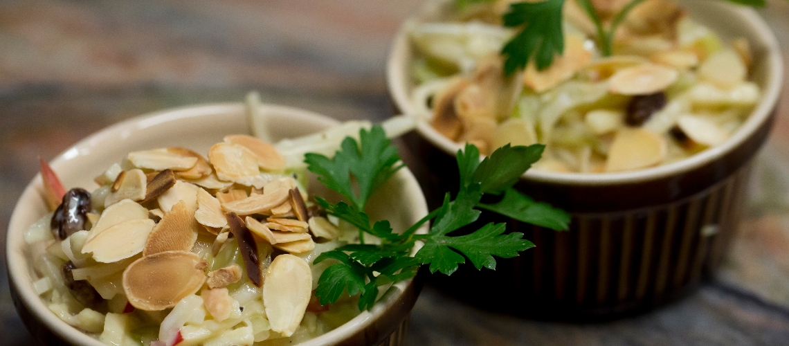 Az almát felcsíkozzuk, citromlével locsoljuk, hogy ne barnuljon meg. A zellergumót és az angol zellert szintén csíkokra vágjuk, és sós vízben előfőzzük, majd lehűtjük. A salátához házi majonézmártást készítünk. A tojások sárgáját mustárral kikeverjük, óvatosan adagoljuk hozzá az olajat, amíg egységes nem lesz. Citromlével savanyítjuk, sózzuk, borsozzuk. Laktózmentes vagy sima tejfölt és tejszínt keverünk hozzá. Ízlés szerint egy kis porcukorral ízesíthetjük. A majonézmártást összeforgatjuk az almával, zellerrel és a mazsolával, majd a végén a mandulával megszórva tálaljuk.