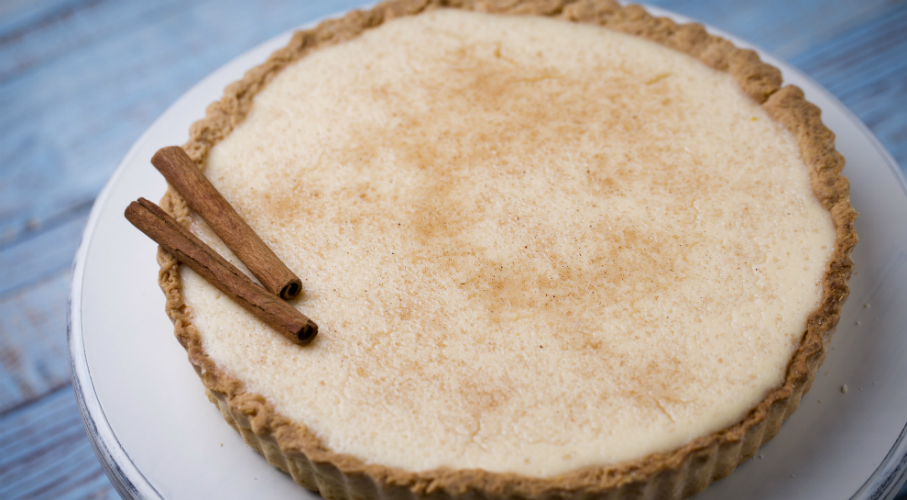 A hozzávalókból tésztát gyúrunk, majd belenyomkodjuk a formába. Hűtőbe tesszük fél-egy órára, majd 190 fokos sütőben 15 percig vakon sütjük nehezékkel, majd 5-8 percig nehezék nélkül készre sütjük. A tejet felforraljuk és a vaj kivételével a többi hozzávalót kézi habverővel kihabosítjuk. A forró tejet keverés közben hozzáöntjük a mixhez, majd visszaöntjük a lábosba és besűrítjük. A krémhez hozzákeverjük a hideg vajat, majd az elősütött tésztába öntjük. A tetejét megszórjuk fahéjas cukorral és kihűtjük.