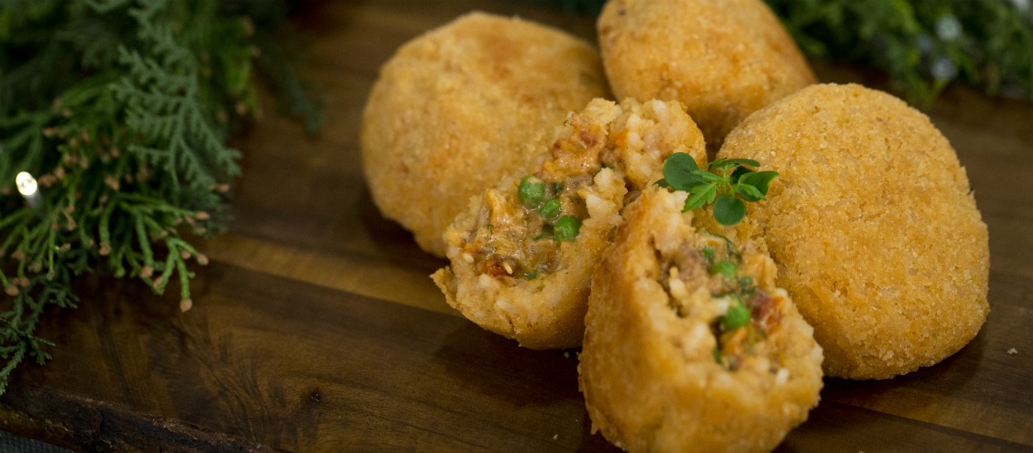 A zellert és a hagymát apróra vágjuk. Olíva olajban megpároljuk a hagymát, hozzáadjuk mindkét húst, kérget sütünk rájuk. Hozzáadjuk a paradicsom pürét, majd egy kevés meleg vizet is öntünk rá, sózzuk, borsozzuk, 2 óra hosszát nagyon lassú tűzön főzzük. Időnként pótoljuk az elfőtt levet. Száraz rizottót készítünk, azaz kevésbé zaftosra főzzük. A vékonyra szeletelt hagymát megpároljuk, fehér borral felöntjük, hozzáadjuk a rizst. Lassanként adagoljuk az alaplevet, amint elkészült, egy tálban hűlni hagyjuk. Amikor langyos lesz, belekeverjük a tojást és a paradicsomos szószt. A zöldborsót hagyományos módon megfőzzük. Vékonyra szeletelünk egy fehér hagymát, megpároljuk, fehér bort öntünk rá, majd ebbe beletesszük a zöldborsót. A húst felaprítjuk (késsel, vagy mixerrel), a megfőtt zöldborsót a húshoz és a kolbászhoz adjuk. Besamel mártást készítünk, vajjal, liszttel majd tejet öntünk hozzá, sózzuk, borsózzuk, végül szerecsendióval ízesítjük. A hús levével összekeverjük a zöldborsót és a kolbászokat, ez lesz a töltelék. A rizsből gombócokat formázunk, lyukat vájunk a közepébe, majd a besamel mártásos kompozíciót beletesszük a lyukba, végül lezárjuk. Megforgatjuk a felvert tojás fehérjében, a prézliben majd bő olajban megsütjük, papírtörlőn lecsepegtetjük, és tálaljuk.