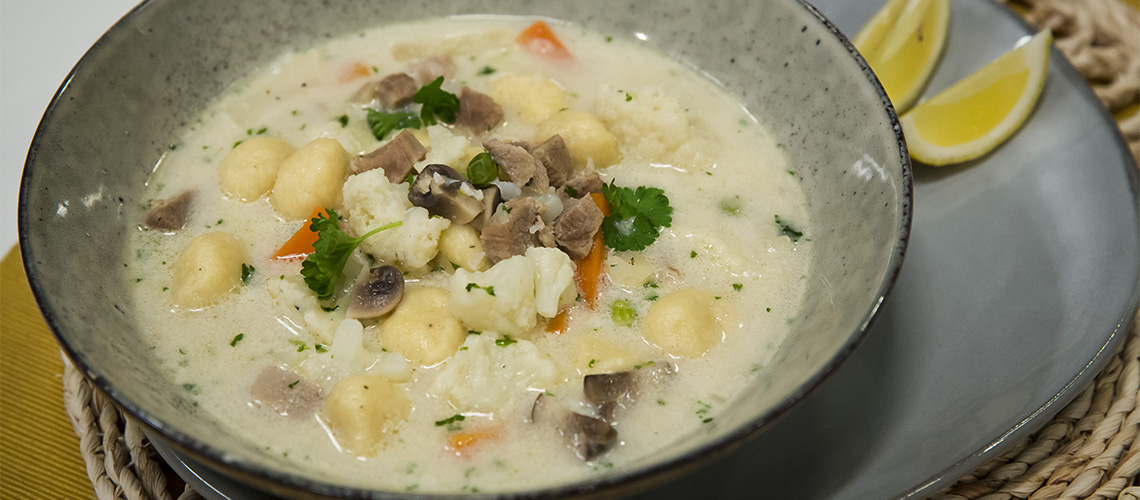 Finomra vágott vöröshagymán háromnegyedig megpároljuk a kockázott borjúhúst, majd hozzáadjuk a darabolt gyökérzöldségeket. Sózzuk, fűszerezzük fokhagymával, őrölt borssal. Ezután tesszük a levesbe a szintén darabolt karfiolt, gombát, illetve a zöldborsót. Mikor majdnem puhák a hozzávalók, a levest világos vajas rántással sűrítjük, és tejszínnel dúsítjuk. A főtt burgonyát lereszeljük vagy összetörjük és tojássárgája, liszt, zsír, só, őrölt bors, szerecsendió hozzáadásával közepesen lágy tésztát gyúrunk. Ebből készült gombócokat főzünk a levesbe. Tálalás előtt friss vágott petrezselyemmel szórjuk, és citromlével ízesítjük.
