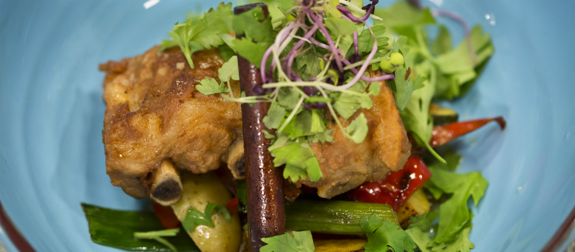 A pirított zöldségeket a tányérra tesszük, rá az oldalast, meglocsoljuk a mártással és bőven megszórjuk a vágott, friss korianderrel.