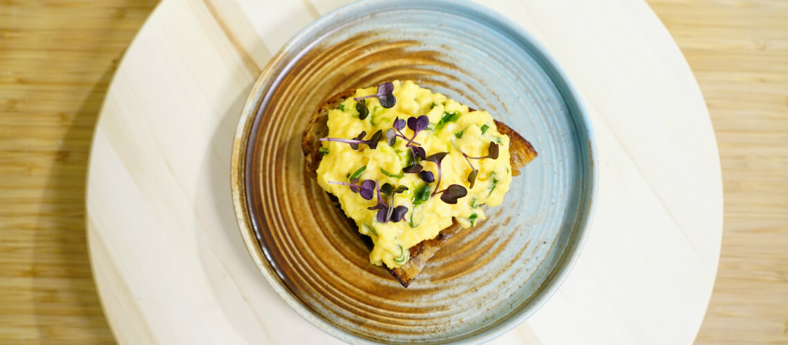 2 nagy tojás, 1 szál újhagyma, 1 fej karamellizált lilahagyma, 1 szelet kenyér (lehetőleg házikenyér), só, bors ízlés szerint és mikrozöld a dekorációhoz. Az elkészítési idő 15 perc. Jó étvágyat!