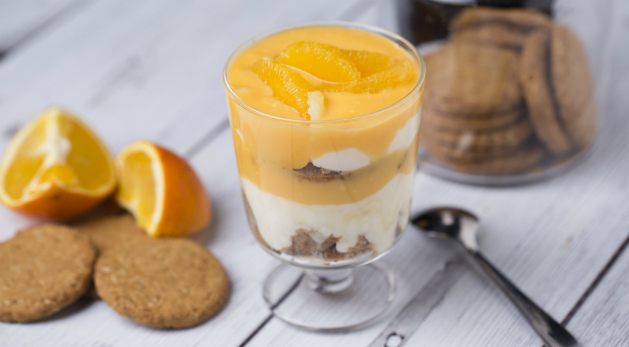 A narancs levét, a vaj felét, a cukrot és az enyhén felvert tojásokat és tojássárgákat lábosba tesszük és alacsony lángon, kevergetve addig főzzük, amíg elkezd sűrűsödni. Ekkor hozzákeverjük a vaj másik felét és kevergetve addig főzzük, amíg sűrű és fényes lesz. A végén hozzákeverem a narancshéjat is. Hagyjuk langyosra hűlni, a tetejére vizes sütőpapírt teszünk, hogy ne bőrösödjön. Összeállítjuk a desszertet: egy pohár aljára zabkekszet morzsolunk, erre néhány kanál mézzel kikever görög joghurtot kanalazunk, majd 1-2 ek narancskrém következik. A tetejére kifilézett narancsszeleteket teszünk és megszórjuk kb. 1 tk. kekszmorzsával.