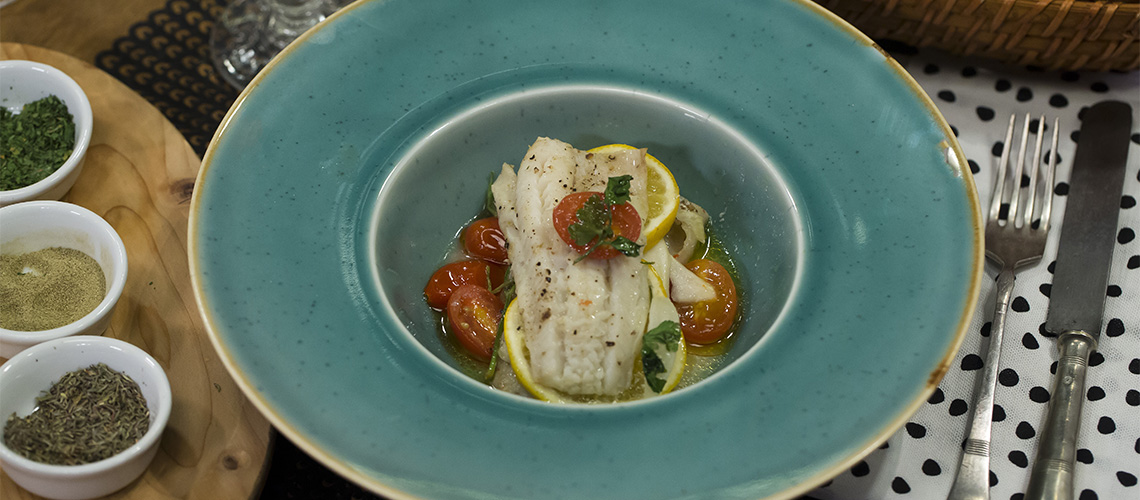 Sütőpapírból zsebet készítünk. A megfűszerezett halat belecsúsztatjuk. Az édesköményt apró szeletekre vágjuk, és összekeverjük koktélparadicsommal, fűszerekkel, fokhagymával, salottával, majd a halhoz adunk. Öntsünk hozzá olívaolajat, kevés fehérbort – alaposan zárjuk le! 200 fokos forró sütőbe tesszük. Körülbelül 15 percig sütjük, majd hagyjuk pihenni. Öntsük le a kifőtt levet, verjük fel benne a vajat, fűszerezzük meg. Pirított kenyérrel tálaljuk.
