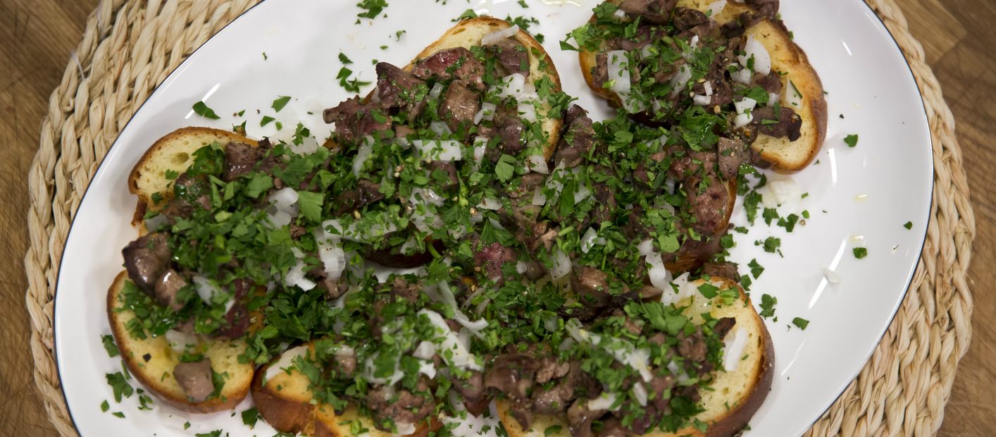 A barheszt felszeleteljük, enyhén meglocsoljuk olívaolajjal, és a serpenyőben megpirítjuk. Rászedjük a májat, sózzuk, borsozzuk, megszórjuk a kockákra vágott hagymával és a sok-sok petrezselyemmel.