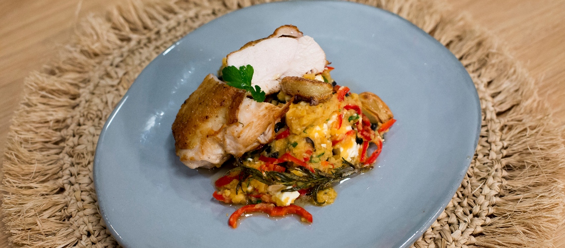 Alaposan szárítsuk meg a bőrös csirkemelleket, ízesítsük sóval és borssal, és hagyjuk szobahőmérsékleten. A vörös lencsét főzzük meg sós vízben, körülbelül 10-15 perc alatt. Vágjuk fel a feta sajtot és olajbogyót. Enyhén megsütjük a paprikát olívaolajban, kevés sóval és cukorral. Egy serpenyőben megpirítjuk a melleket, és sütőben kb. 10 perc alatt 180 fokon készre sütjük. Keverjük össze a lencsét paprikával, fetával, olajbogyóval és finomra vágott petrezselyemmel.