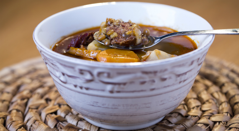 A felkockázott hagymát a kolbászszeletekkel és a fűszerekkel olívaolajon pár percig izzasztjuk, majd hozzáadjuk az összetört fokhagymát és 2-3 percig kevergetve pirítjuk. Beletesszük a lencsét, a felkarikázott répákat, felöntjük 2 l vízzel, sózzuk és borsozzuk és fedő alatt közepes lángon addig főzzük, amíg a lencse megpuhul – kb. 40 perc. Időnként megkóstoljuk és fokozatosan sózzuk. Ha a lencse puha, elzárjuk a lángot, a leveshez keverjük 1 citrom frissen facsart levét. Lefedjük, 10 percig pihentetjük, forrón tálaljuk.