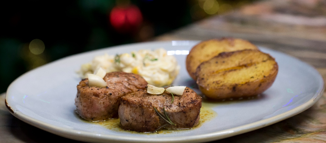 A szűzet kétujjnyi szeletekre vágjuk, sózzuk, borsozzuk. Hirtelen körbesütjük olaj és vaj keverékén. Egy tányérra szedjük, vajat, fokhagymát és zöldfűszereket teszünk rá, hogy aromásabb legyen. Így mehet a sütőbe 100 fokon “átsülni”, 10 percre.