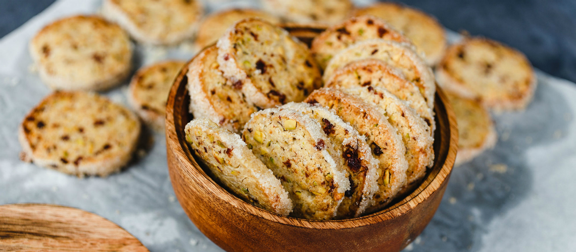 A sütőt 160 fokra melegítem, 2 tepsit sütőpapírral kibélelek. Az egyik hasábot kiveszem a hűtőből, minden oldalát a kissé felvert tojással megkenem, cukorba hempergetem (vagy megszórom) és NAGYON ÉLES késsel kb. 1/2 cm-es szeleteket vágok (figyelni kell, mert a pisztáciák miatt nem nagyon könnyű a szeletelés, de ha jó hidegen csináljuk, működik). Érdemes minden szelet után fordítani egyet a hasábon, hogy megtartsa szögletes formáját.