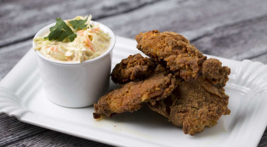 A csirkét feldaraboljuk. Még a combokat és a melleket is 2-3 darabra vágjuk. A bőrét rajta hagyjuk. A kefírt kevés tabasco szósszal és némi sóval összekeverjük, majd ebben pácoljuk a csirkehúst min. 60 percig, de akár 12 órán keresztül is. A lisztet sózzuk, fűszerezzük fűszerpaprikával, oregánóval, cayenne borssal. A kefírből kivett csirke darabokat megforgatjuk a lisztben, tojásban és zsemlemorzsában, majd bő, forró olajban 10 perc alatt aranysárgára sütjük. Előmelegített 160 fokos sütőben, vajdarabokkal a húsok tetején, 35-40 perc alatt átsütjük. 1 tojás sárgáját mustárral kikeverünk, az olajat lassan hozzácsurgatva, folyamatos keveréssel majonézt készítünk. Hozzáadjuk a tejszínt, ízesítjük sóval, citromlével, porcukorral, almaecettel, majd borsozzuk. A káposztát nagyon vékony csíkokra vágjuk. Hozzáreszeljük az uborkát és a sárgarépát. Összeforgatjuk a mártással. Ezt kínáljuk a rántott csirke mellé.