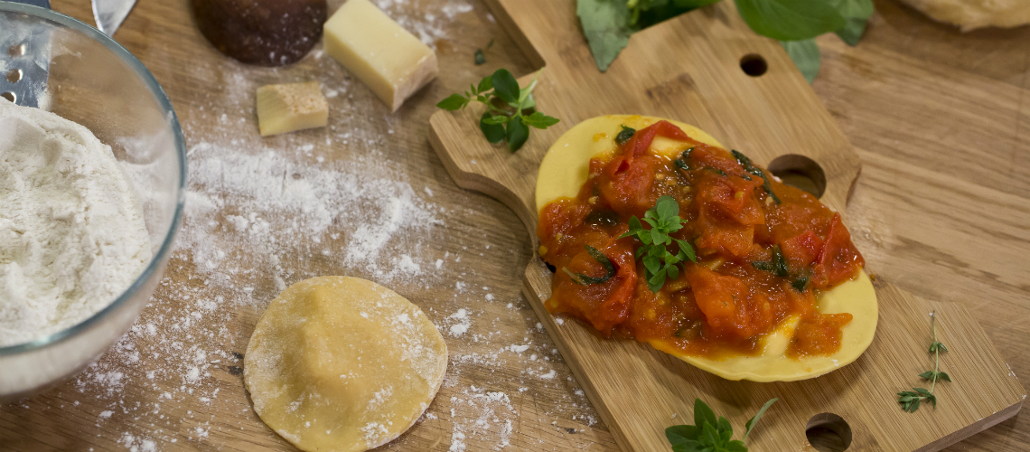 Egy lábosban 1 l vizet felforralunk, majd hozzáadjuk a lisztet és addig keverjük, amíg egy homogén masszát nem kapunk. Hagyjuk hűlni, és ugyanúgy dolgozunk vele, mint a hagyományos házi tésztával. Könnyű paradicsomszószt készítünk, hideg olajon kezdve, bazsalikomot és sót adunk a paradicsomhoz. Elkészítjük a tölteléket: lereszeljük a házi sajtot, hozzáadunk 150g parmezánt, 2 tojást és a kakukkfüvet, és jól összekeverjük. Vékonyra nyújtjuk a tésztát, belehelyezzük a tölteléket, egy másik réteg tésztával lefedjük és méretre vágjuk. A raviolit lobogó sós vízben 3 percig főzzük, majd hozzáadjuk a paradicsomszószt. Ízlés szerint parmezánnal szórjuk meg.