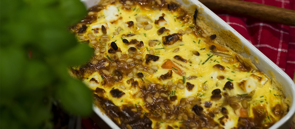 A megtisztított sárgarépát forrásban lévő sós vízben megfőzzük. A szalonnát nagyobb darabokra vágjuk, és vajon kisütjük. Adjuk hozzá a durvára vágott hagymát, és pirítsuk aranybarnára. Hagyjuk kihűlni. Gyúrjuk be a tésztát, tegyük egy tepsire, a répás-hagymás keveréket halmozzuk a tetejére. A szalonnát és a tojást összekeverjük, a sajttal a hagymára öntjük. 190 fokon aranybarnára sütjük.