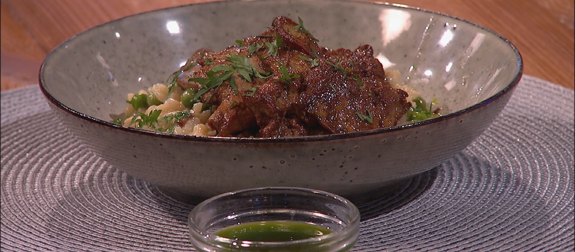 Ha szépen megpirult és a közepe még kissé rózsaszín, de nem véres, levesszük a tűzről és megsózzuk, mellé dobunk egy kis darab vajat és összeforgatjuk vele. A risi e bisi tetejére helyezve tálaljuk, meglocsoljuk petrezselyem olajjal és finomra aprított petrezselyemmel megszórjuk.