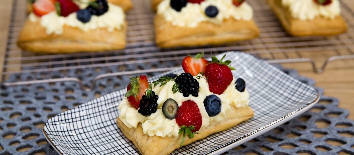 Ropogós alapú torta, vaníliás mouseline és friss erdei gyümölcsökkel