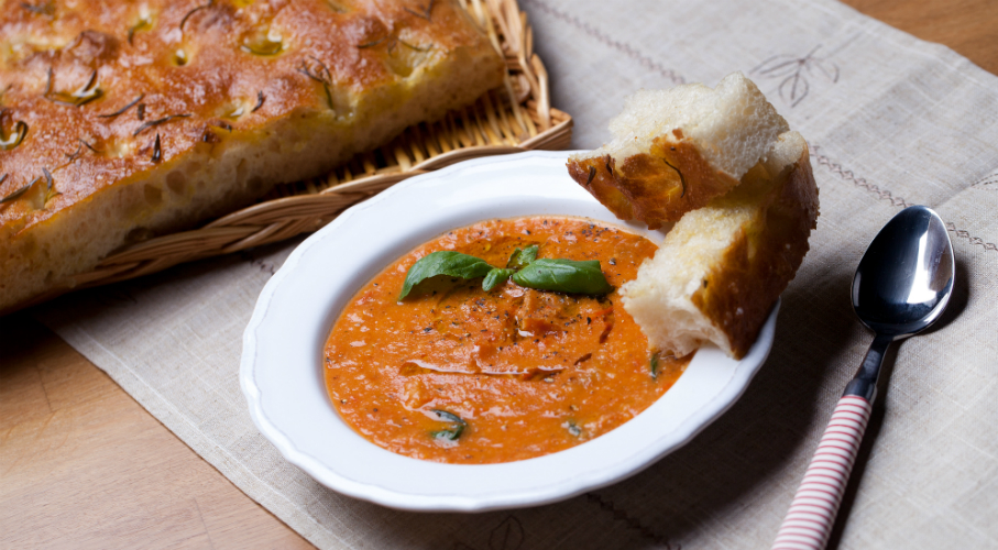 A négybe vágott paradicsomot és lilahagymát a fokhagymával együtt egy tepsibe tesszük, sózzuk borsozzuk majd nyakon öntjük olívaolajjal. 180 fokos sütőben addig sütjük, amíg levet ereszt és karamellizálódni kezd a paradicsom. Ha ezzel megvagyunk, az összesült zöldségeket egy lábosba tesszük, majd botmixerrel enyhén darabosra turmixoljuk. A leves térfogatát zöldségalaplével növeljük, amikor elértük a kívánt állagot, friss bazsalikommal, ízlés szerint sóval, borssal és fokhagymával ízesítjük. Ha szeretnénk, hogy igazán különleges legyen ez a fogás, utolsó lépésként egy kevés focacciát turmixolhatunk hozzá, ezáltal egy gazdag, testes ételt kapunk. Tálaláskor friss bazsalikomot és parmezánt használhatunk, esetleg egy kis olívaolajjal is meglocsolhatjuk.