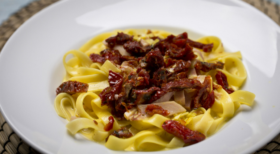 A zúzott fokhagymát és a póréhagymát kevés olajban megpirítjuk, majd borban felpároljuk. Hozzáadjuk az alaplevet és a sáfrányt. Sózzuk, borsozzuk, majd felöntjük tejszínnel. Néhány percet forraljuk, majd a frissen főtt tésztával és a csíkozott sonkával egybeforgatjuk. Aszalt paradicsommal tálaljuk.