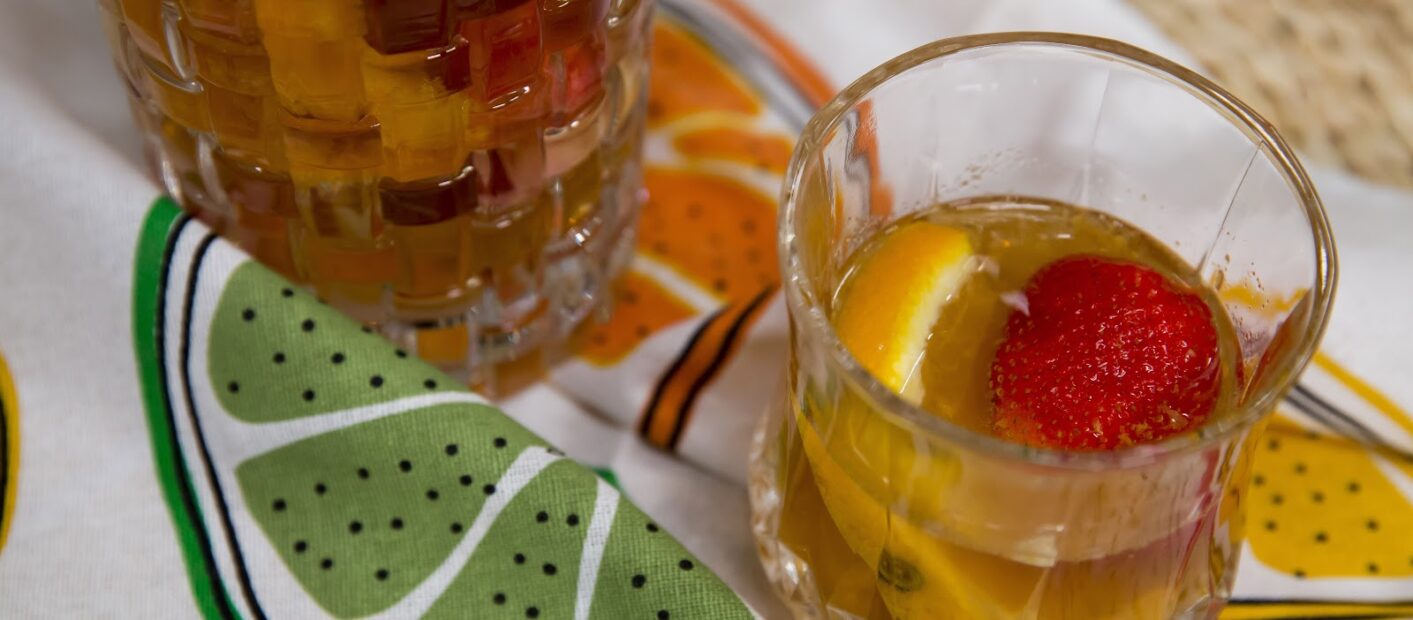 A gyümölcsöt felszeleteljük, és egy kancsóba tesszük, majd felöntjük a borral, és legalább egy órán át hűtjük, hogy a bor átvegye a gyümölcsök ízét.