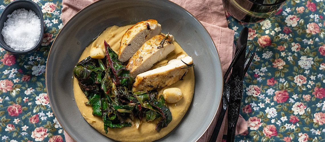 Tálaláskor a sárgaborsó pürére kanalazunk a mángoldból és mellé teszünk egy szelet húst. A hús szaftjával meglocsoljuk az ételt és azonnal fogyasztjuk.