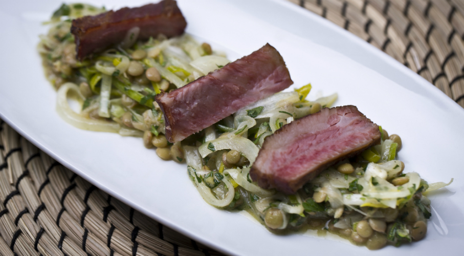 A főtt lencsét lecsöpögtetjük. Mustárral, citromlével, olívaolajjal, sóval, borssal salátaöntetet készítünk, melyet az összevágott, lesózott és kinyomkodott hagymákra teszünk. Egybeforgatjuk a lencsével és akár füstölt hússal is tálalhatjuk.