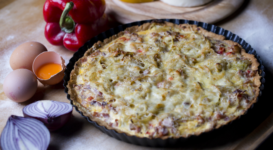 A lisztet vajjal, tejjel és egy darab tojással összemorzsoljuk, sót, cukrot adunk hozzá, majd tésztát gyúrunk belőle és fél órára a hűtőbe tesszük. Kinyújtjuk és egy tortaformába nyomkodjuk. Néhány percig pihentetjük, majd a villával megszurkált tésztát lesúlyozva, 180 fokos sütőben 15 perc alatt elősütjük. Kicsit hagyjuk hűlni. Ez idő alatt a vékony szeletekre vágott hagymát aranybarnára pirítjuk, sózzuk, borsozzuk és beleterítjük a tésztába, rászórjuk a darabolt sonkát (esetleg paprikát) és tojásos, tejszínes keverékkel leöntjük. A tetejére sajtot reszelünk és 15 perc alatt készre sütjük.