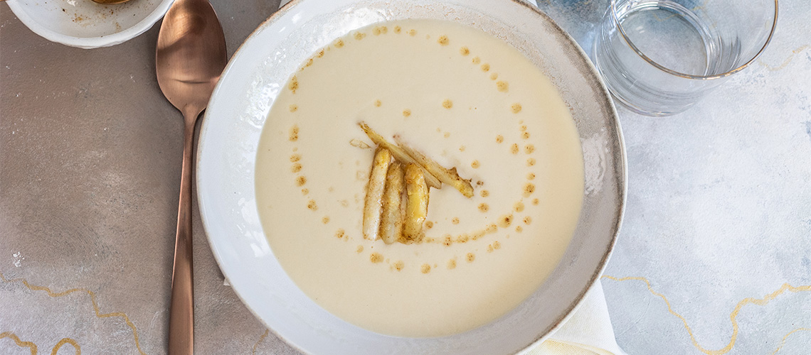 A vajat egy közepes lábosban felmelegítjük, erre tesszük a póréhagymát és a spárga feldarabolt, megtisztított szárát – a fejeket félretesszük. Ha kellően megpirultak, mehet rá a burgonya és a fehérbor. Egy kicsit hagyjuk rotyogni, majd felöntjük a zöldségalaplével, sózzuk és kevés fehér borssal ízesítjük.