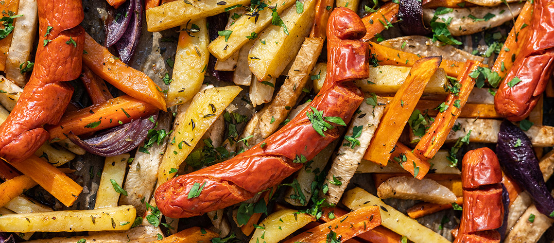 A zöldségeket egy sütőpapírral leterített tepsire tesszük összekeverjük, ráöntjük a mázt és ezzel is összeforgatjuk. 200 °-ra előmelegített sütőben 2025 percig sütjük, majd kivesszük a sütőből elrendezzük rajta be vagdosott kolbászokat. Visszatesszük a sütőbe és addig sütjük amíg a zöldségek ropogósra sülnek és a kolbász is elkészül.